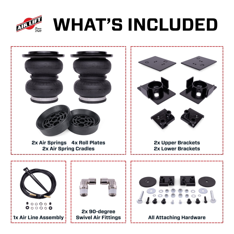 Offering up to 3,400 lbs. of load-leveling capacity, the LoadLifter kit with Universal Air Spring Cradles for the 2020-2025 Jeep Gladiator 4WD from Air Lift makes towing and hauling comfortable and stress-free. Our fully adjustable, industry-leading air springs are the perfect partner for your vehicle. The kit also includes Air Spring Cradles, allowing the air springs to detach from the lower bracket for full suspension extension, ideal for overlanding and off-roading. The LoadLifter kit helps eliminate problems frequently encountered when towing and hauling, such as squat, trailer sway, body roll, and bottoming out. With the added stability and weight distribution that air springs provide, you can haul safely with optimal braking and steering control. It is engineered to provide years of exceptional suspension support without potential concerns about damage to the frame or other components. As the leader in air suspension products for over 75 years, Air Lift is committed to delivering quality load support parts that last. The key suspension components have all been torture-tested to ensure the highest quality, longevity, and customer satisfaction. Backed by a lifetime warranty and a 60-day ride satisfaction guarantee.
