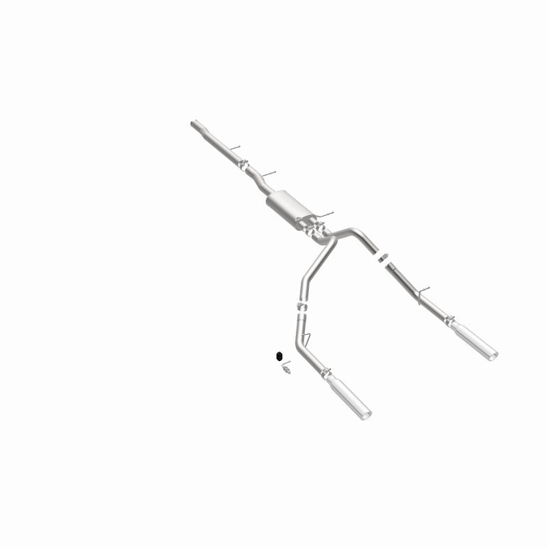 The MagnaFlow Street Series Cat-Back Performance Exhaust System 15565 brings out the personality of your Truck with our signature resonant, powerful engine tone and dyno-proven performance. Thanks to its fast-flowing, mandrel bent 3in. main piping and 1 Straight-Through mufflers ending in a Dual Split Rear exit with 3.5in. Polished Clamp-On Single Wall Angle Cut Rolled Edge tips, this Truck exhaust kit has the performance chops to match its sporty sound and appearance. Upgrade your ride to the next level with an exhaust that has the pipes to put other Truck's to shame. With this system your vehicle will be producing Aggressive exterior and Moderate interior sound levels while leaving other cars and trucks feeling envious at every stoplight. Exhaust kit 15565 features a cat-back layout that replaces your ride's stock exhaust components from near the catalytic converter on back. Extensive 3D scanning during development has resulted in a direct-fit design that you can easily install yourself. 15565 is produced using CNC precision robotic manufacturing techniques and is backed by MagnaFlow's 1-year limited finish warranty and limited lifetime construction warranty.