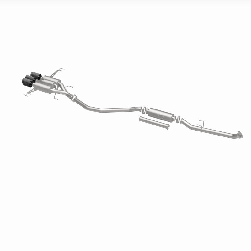 The MagnaFlow Honda Civic Type R xMOD Series Performance Exhaust System #19383 brings the cutting-edge modularity of our xMOD Series to one of America’s most popular vehicles. This cat-back exhaust kit is designed to enhance your 2.0L 2017-2021 Honda Civic with dyno-proven performance made possible thanks to fast-flowing mandrel bent 2.5” diameter piping that passes through three straight-through mufflers and one multi-chamber muffler, ending in a triple center rear exit with 4.5” flanking carbon tips and a 4” center carbon tip. The direct-fit design replaces all OEM exhaust components from near the catalytic converter on back. Exhaust system #19383 is engineered to allow your Honda Civic Type R exhaust note to be tailored to your liking by choosing between the easily swappable muffler or straight pipe modules, each secured using racing bred V-band clamps. #19383’s direct-fit design makes installation a breeze thanks to the use of advanced 3D scanning during development. This performance exhaust system is made of 100% durable and corrosion-resistant stainless steel and produced using CNC precision robotic manufacturing techniques, all backed by MagnaFlow’s limited lifetime construction warranty. Please check to ensure compliance with local noise regulations.